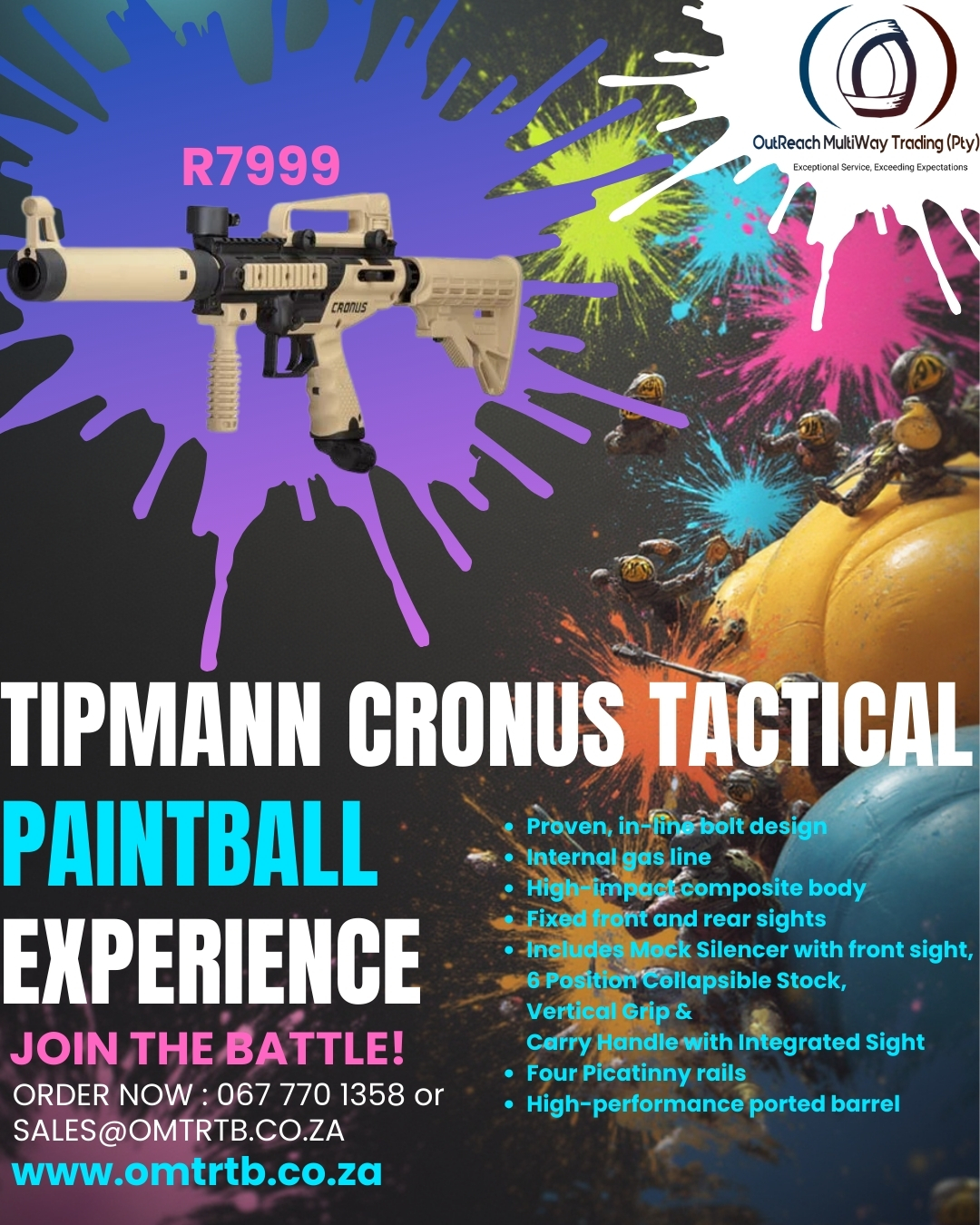 Included: Tippmann Cronus Tactical, Hopper (200 Ball), 20 ounce co2 Cylinder, On/Off Preset Valve, x200 Nylon Balls, x10 Pepper Balls, Delivery